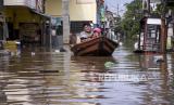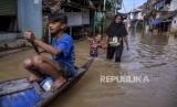 Sejumlah warga menggunakan perahu melintasi banjir di Kampung Bojongasih, Kecamatan Dayeuhkolot, Kabupaten Bandung, Jumat (25/12). Banjir luapan Sungai Citarum setinggi 30 hingga 120 cm kembali merendam ribuan tempat tinggal dan mengakibatkan sedikitnya 2.000 kepala keluarga terdampak. (FOTO : ABDAN SYAKURA/REPUBLIKA)