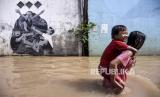 Sejumlah anak berjalan melintasi banjir di Kampung Bojongasih, Kecamatan Dayeuhkolot, Kabupaten Bandung, Jumat (25/12). Banjir luapan Sungai Citarum setinggi 30 hingga 120 cm kembali merendam ribuan tempat tinggal dan mengakibatkan sedikitnya 2.000 kepala keluarga terdampak. (FOTO : ABDAN SYAKURA/REPUBLIKA)