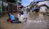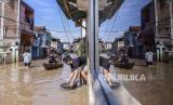 Sejumlah warga melintasi banjir di Kampung Bojongasih, Kecamatan Dayeuhkolot, Kabupaten Bandung, Jumat (25/12). Banjir luapan Sungai Citarum setinggi 30 hingga 120 cm kembali merendam ribuan tempat tinggal dan mengakibatkan sedikitnya 2.000 kepala keluarga terdampak. (FOTO : ABDAN SYAKURA/REPUBLIKA)