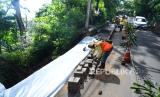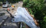 Petugas Dinas Bina Marga dan Penataan Ruang (DBMPR) memasang pembatas di lokasi longsor tanjakan kawasan Curug Cimahi Jalan Kolonel Masturi, Kecamatan Cisarua, Kabupaten Bandung Barat, Ahad (27/12). Longsor di jalan yang menjadi salah satu akses Cimahi-Lembang, terjadi Sabtu (26/12) sore. Dalam peristiwa tersebut arus lalu lintas dilakukan sitem buka tutup secara bergiliran. (FOTO : Edi Yusuf/Republika)