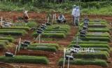 Petugas saat mengurus makam Covid-19 di TPU Pondok Ranggon, Jakarta, Selasa (29/12). Blok makam Covid-19 di TPU Pondok Ranggon untuk jenazah muslim maupun non muslim sudah penuh dengan total 4.650 jenazah telah dimakamkan sepanjang Maret hingga 25 Desember 2020. Republika/Putra M. Akbar (FOTO : Republika/Putra M. Akbar)