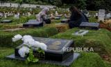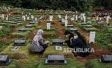 Warga saat berziarah di makam Covid-19 di TPU Pondok Ranggon, Jakarta, Selasa (29/12). Blok makam Covid-19 di TPU Pondok Ranggon untuk jenazah muslim maupun non muslim sudah penuh dengan total 4.650 jenazah telah dimakamkan sepanjang Maret hingga 25 Desember 2020.  (FOTO : Republika/Putra M. Akbar)