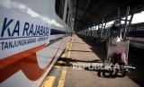 REPUBLIKA.CO.ID, PALEMBANG -- Penumpang berjalan menuju gerbong kereta api Rajabasa tujuan Palembang-Tanjung Karang, Bandar Lampung di stasiun Kertapati, Palembang, Sumatera Selatan, Jumat (1/1/2021).