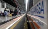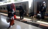 Penumpang kereta api Dharmawangsa dari Surabaya tiba di Stasiun Pasar Senen, Jakarta, Minggu (3/1). (FOTO : Akbar Nugroho Gumay/ANTARA FOTO)