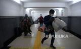 Sejumalah penumpang kereta berjalan menuju pintu keluar di Stasiun Pasar Senen, Jakarta, Ahad (3/1). (FOTO : Prayogi/Republika.)