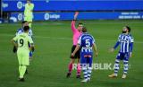 Bek Alaves, Victor Laguardia (tengah) dikeluarkan dari lapangan pada pertandingan sepak bola La Liga Spanyol antara Deportivo Alaves dan Atletico de Madrid di Stadion Mendizorroza di Vitoria, Basque Country, Spanyol, Ahad (3/1). (FOTO : EPA-EFE / JON RODRIGUEZ BILBAO)