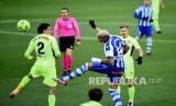 Striker Alaves Deyverson (kiri) duel perebutan bola melawan bek Atletico Felipe Monteiro (kanan) pada pertandingan sepak bola LaLiga Spanyol antara Deportivo Alaves dan Atletico de Madrid di stadion Mendizorroza di Vitoria, Basque Country, Spanyol, Ahad (3/1). (FOTO : EPA-EFE / JON RODRIGUEZ BILBAO)