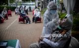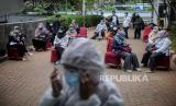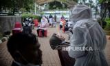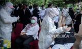 Sejumlah karyawan di lingkungan Kementerian Agama mengikuti tes PCR di Gedung Kementerian Agama, Jakarta, Senin (4/1). Tes PCR tersebut dilakukan kepada 300 karyawan saat hari pertama kerja usai libur Natal 2020 dan Tahun Baru 2021 guna mengantisipasi penyebaran covid-19 di lingkungan Kementerian Agama. (FOTO : Republika/Thoudy Badai)