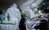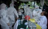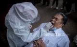 Sejumlah karyawan di lingkungan Kementerian Agama mengikuti tes PCR di Gedung Kementerian Agama, Jakarta, Senin (4/1). Tes PCR tersebut dilakukan kepada 300 karyawan saat hari pertama kerja usai libur Natal 2020 dan Tahun Baru 2021 guna mengantisipasi penyebaran covid-19 di lingkungan Kementerian Agama. Republika/Thoudy Badai (FOTO : Republika/Thoudy Badai)