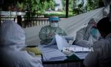 Petugas medis merapikan berkas karyawan di lingkungan Kementerian Agama untuk mengikuti tes PCR di Gedung Kementerian Agama, Jakarta, Senin (4/1). Tes PCR tersebut dilakukan kepada 300 karyawan saat hari pertama kerja usai libur Natal 2020 dan Tahun Baru 2021 guna mengantisipasi penyebaran covid-19 di lingkungan Kementerian Agama. Republika/Thoudy Badai (FOTO : Republika/Thoudy Badai)