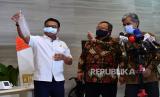 Menristek Bambang Brodjonegoro (kiri) menyerahkan alat deteksi dini COVID-19 bernama GeNose C19 kepada Kepala Staf Kepresidenan Moeldoko (tengah) disaksikan Kepala Produksi Konsorsium GeNos C19 Eko Fajar Prasetyo di Gedung Binagraha, Kompleks Istana Kepresidenan, Jakarta, Senin (4/1/2021). Kementerian Riset dan Teknologi menghibahkan satu unit GeNose C19 yang merupakan karya tim peneliti UGM kepada Kantor Staf Kepresidenan untuk membantu screening COVID-19 di lembaga negara tersebut. (FOTO : SIGID KURNIAWAN/ANTARA )