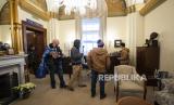Pendukung Presiden AS Donald J. Trump berdiri di dalam kantor Ketua DPR AS Nancy Pelosi, setelah pendukung Presiden AS Donald J. Trump menerobos gedung Capitol AS di Washington, DC, AS, 06 Januari 2021. Para pengunjuk rasa menyerbu Gedung Kongres AS tempat berlangsungnya sertifikasi suara Electoral College untuk Presiden terpilih Joe Biden. (FOTO : EPA-EFE/JIM LO SCALZO)