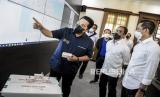 Menteri BUMN Erick Thohir (kiri) melihat layar pendistribusian vaksin Covid-19 saat kunjungan kerja di PT Bio Farma, Jalan Pasteur, Kota Bandung, Kamis (7/1). Dalam kunjungan kerjanya, Menteri BUMN Erick Thohir meninjau fasilitas infrastruktur vaksin Covid-19 mulai dari ruang penyimpanan vaksin hingga tahapan pendistribusian ke 34 provinsi di Indonesia serta memastikan kesiapan PT Bio Farma (Persero) dalam memproduksi vaksin Covid-19. F (FOTO : ABDAN SYAKURA/REPUBLIKA)