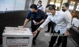 Menteri BUMN Erick Thohir (kiri) melihat kemasan vaksin Covid-19 saat kunjungan kerja di PT Bio Farma, Jalan Pasteur, Kota Bandung, Kamis (7/1). Dalam kunjungan kerjanya, Menteri BUMN Erick Thohir meninjau fasilitas infrastruktur vaksin Covid-19 mulai dari ruang penyimpanan vaksin hingga tahapan pendistribusian ke 34 provinsi di Indonesia serta memastikan kesiapan PT Bio Farma (Persero) dalam memproduksi vaksin Covid-19. (FOTO : ABDAN SYAKURA/REPUBLIKA)