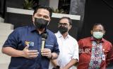 Menteri BUMN Erick Thohir (kiri) memberikan keterangan kepada wartawan usai kunjungan kerja di PT Bio Farma, Jalan Pasteur, Kota Bandung, Kamis (7/1). Dalam kunjungan kerjanya, Menteri BUMN Erick Thohir meninjau fasilitas infrastruktur vaksin Covid-19 mulai dari ruang penyimpanan vaksin hingga tahapan pendistribusian ke 34 provinsi di Indonesia serta memastikan kesiapan PT Bio Farma (Persero) dalam memproduksi vaksin Covid-19. (FOTO : ABDAN SYAKURA/REPUBLIKA)