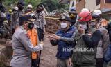 Gubernur Jawa Barat Ridwan Kamil (kanan) berbincang dengan Kapolda Jawa Barat Irjen Pol Ahmad Dofiri (kiri) saat meninjau lokasi bencana tanah longsor di Desa Cihanjuang, Kecamatan Cimanggung, Kabupaten Sumedang, Ahad (10/1). (FOTO : ABDAN SYAKURA/REPUBLIKA)