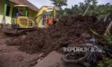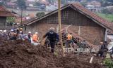Petugas gabungan membersihkan material longsor yang menimbun rumah warga di Desa Cihanjuang, Kecamatan Cimanggung, Kabupaten Sumedang, Ahad (10/1). (FOTO : ABDAN SYAKURA/REPUBLIKA)