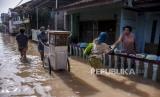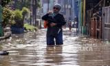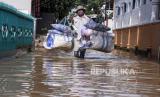 Pedagang melintasi genangan banjir di Kampung Bojongasih, Kecamatan Dayeuhkolot, Kabupaten Bandung, Senin (11/1). Banjir luapan Sungai Citarum tersebut diakibatkan oleh tingginya intensitas curah hujan yang mengguyur kawasan Bandung Raya pada Ahad (10/1) sore hingga malam hari dan membuat permukiman di kawasan tersebut terendam banjir setinggi 50 sentimeter hingga satu meter. bna (FOTO : ABDAN SYAKURA/REPUBLIKA)