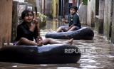 Sejumlah anak bermain di genangan banjir di Kampung Bojongasih, Kecamatan Dayeuhkolot, Kabupaten Bandung, Senin (11/1). Banjir luapan Sungai Citarum tersebut diakibatkan oleh tingginya intensitas curah hujan yang mengguyur kawasan Bandung Raya pada Ahad (10/1) sore hingga malam hari dan membuat permukiman di kawasan tersebut terendam banjir setinggi 50 sentimeter hingga satu meter. (FOTO : ABDAN SYAKURA/REPUBLIKA)