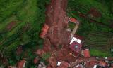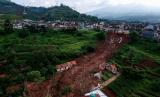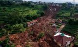 Foto udara bencana tanah longsor di Cimanggung, Kabupaten Sumedang, Jawa Barat, Selasa (12/1/2021). Tim SAR gabungan masih mencari sedikitnya 24 korban hilang yang telah terdata akibat bencana tanah longsor yang terjadi pada Sabtu (9/1) lalu.  (FOTO : ANTARA/Raisan Al Farisi)
