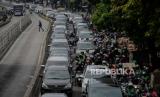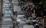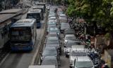 Sejumlah kendaraan terjebak macet saat jam berangkat kerja di kawasan Mampang Prapatan, Jakarta, Selasa (12/1). Pada hari kedua Pemberlakuan Pembatasan Kegiatan Masyarakat di DKI Jakarta sejumlah jalan protokol dikawasan tersebut terpantau padat. Republika/Thoudy Badai (FOTO : Republika/Thoudy Badai)