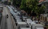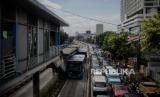 Sejumlah kendaraan terjebak macet saat jam berangkat kerja di kawasan Mampang Prapatan, Jakarta, Selasa (12/1). Pada hari kedua Pemberlakuan Pembatasan Kegiatan Masyarakat di DKI Jakarta sejumlah jalan protokol dikawasan tersebut terpantau padat. (FOTO : Republika/Thoudy Badai)