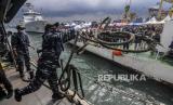 Prajurit TNI melempar tali untuk menyandarkan kapal usai pencarian korban dan puing pesawat Sriwijaya Air nomor penerbangan SJ182 di Dermaga JICT II, Jakarta, Selasa (12/1). (FOTO : Republika/Putra M. Akbar)
