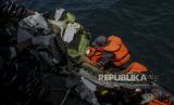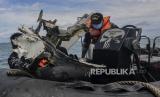 Sejumlah prajurit TNI membawa puing bagian pesawat Sriwijaya Air nomor penerbangan SJ182 di perairan Kepulauan Seribu, Jakarta, Selasa (12/1). (FOTO : Republika/Putra M. Akbar)