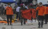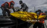 Sejumlah prajurit TNI membawa kantong berisi temuan saat pencarian korban dan puing pesawat Sriwijaya Air nomor penerbangan SJ182 di perairan Kepulauan Seribu, Jakarta, Selasa (12/1). (FOTO : Republika/Putra M. Akbar)