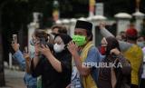 Warga menyaksikan iring-iringan mobil jenazah yang membawa almarhum Syekh Ali Jaber melintasi Jalan Cempaka Putih, Jakarta, Kamis (14/1), untuk menuju Pondok Pesantren Daarul Quran. Syekh Ali Jaber wafat di usia 44 tahun karena sakit. Almarhum dimakamkan di pemakaman Pondok Pesantren Daarul Quran, Tangerang, Banten. (FOTO : Edwin Dwi Putranto/Republika)