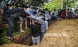 Sejumlah kerabat dan keluarga memasukan tanah ke kuburan Syekh Ali Jaber di Pondok Pesantren Darul Quran, Cipondoh, Kota Tangerang, Banten, Kamis (14/1). (FOTO : Republika/Putra M. Akbar)