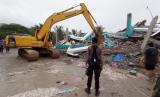 Petugas menggunakan alat berat memindahkan puing bangunan RS Mitra Manakarra yang rusak pascagempa bumi, di Mamuju, Sulawesi Barat, Jumat (15/1/2021). (FOTO : Antara/Akbar Tado)