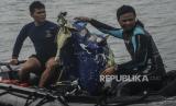 Prajurit TNI AL membawa serpihan bagian pesawat Sriwijaya Air nomor penerbangan SJ 182 saat operasi SAR, di perairan Kepulauan Seribu, Jakarta, Jumat (14/1/2021). Tim SAR gabungan pada hari ketujuh kembali melakukan pencarian Cockpit Voice Recorder (CVR) atau perekam suara kokpit dari pesawat Sriwijaya Air Penerbangan SJ 182 yang jatuh di antara Pulau Laki dan Pulau Lancang pada Sabtu (9/1/2021). (FOTO : ANTARA FOTO/Muhammad Adimaja)