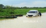 Warga mendorong mobil yang berusaha melintasi banjir luapan Sungai Batanghari di Jalan Lintas Jambi-Berbak, Desa Gedong Karya, Muarojambi, Jambi, Jumat (15/1/2021). Banjir di jalan provinsi yang terus meninggi sejak awal Januari tersebut memutus akses pengendara sepeda motor sehingga dimanfaatkan warga sekitar dengan menyediakan jasa perahu penyeberangan dengan tarif Rp15 ribu per motor. (FOTO : Antara/Wahdi Septiawan)