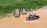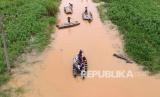 REPUBLIKA.CO.ID, MUAROJAMBI -- Warga menggunakan jasa perahu penyeberangan melintasi Jalan Lintas Jambi-Berbak yang terendam banjir luapan Sungai Batanghari di Desa Gedong Karya, Muarojambi, Jambi, Jumat (15/1).