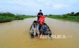 Warga menggunakan jasa perahu penyeberangan melintasi Jalan Lintas Jambi-Berbak yang terendam banjir luapan Sungai Batanghari di Desa Gedong Karya, Muarojambi, Jambi, Jumat (15/1/2021). Banjir di jalan provinsi yang terus meninggi sejak awal Januari tersebut memutus akses pengendara sepeda motor sehingga dimanfaatkan warga sekitar dengan menyediakan jasa perahu penyeberangan dengan tarif Rp15 ribu per motor. (FOTO : Antara/Wahdi Septiawan)