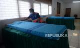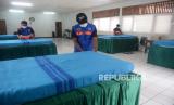 Gugus Tugas RW 003 Kelurahan Pondok Labu merapikan tempat tidur yang akan digunakan untuk isolasi mandiri di Gedung Sasana Krida Karang Taruna, di Jalan Bango III , Pondok Labu, Jakarta, Senin (18/1). Gugus COVID-19 RW 003, Kelurahan Pondok Labu menyipakan Gedung Sasana Krida Karang Taruna sebagai tempat isolasi mandiri untuk warga yang terkonfirmasi positif COVID-19 dengan fasilitas lima tempat tidur. Gedung isolasi ini akan digunakan untuk antisipasi apabila Wisma Atlet dan rumah sakit rujukan penuh. (FOTO : Prayogi/Republika.)