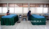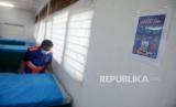 Gugus Tugas RW 003 Kelurahan Pondok Labu merapikan tempat tidur yang akan digunakan untuk isolasi mandiri di Gedung Sasana Krida Karang Taruna, di Jalan Bango III , Pondok Labu, Jakarta, Senin (18/1). Gugus COVID-19 RW 003, Kelurahan Pondok Labu menyipakan Gedung Sasana Krida Karang Taruna sebagai tempat isolasi mandiri untuk warga yang terkonfirmasi positif COVID-19 dengan fasilitas lima tempat tidur. Gedung isolasi ini akan digunakan untuk antisipasi apabila Wisma Atlet dan rumah sakit rujukan penuh.Prayogi/Republika. (FOTO : Prayogi/Republika.)