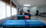 Gugus Tugas RW 003 Kelurahan Pondok Labu menyemprotkan disinfektan pada tempat tidur yang digunakan untuk isolasi mandiri di Gedung Sasana Krida Karang Taruna, di Jalan Bango III , Pondok Labu, Jakarta, Senin (18/1). Gugus COVID-19 RW 003, Kelurahan Pondok Labu menyipakan Gedung Sasana Krida Karang Taruna sebagai tempat isolasi mandiri untuk warga yang terkonfirmasi positif COVID-19 dengan fasilitas lima tempat tidur. Gedung isolasi ini akan digunakan untuk antisipasi apabila Wisma Atlet dan rumah sakit rujukan penuh. (FOTO : Prayogi/Republika.)