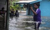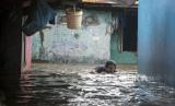 Warga berjalan di sekitar rumahnya yang terendam banjir di Sampangan, Pekalongan, Jawa Tengah, Selasa (19/1/2021). Menurut pemerintah setempat, hujan deras yang terjadi sejak Senin (18/1) mengakibatkan banjir di beberapa kelurahan di Pekalongan, dengan ketinggian antara 30 centimeter-1,5 meter dan berdampak kepada 3.000 Kepala Keluarga (KK) dan 500 warga mengungsi di tempat pengungsian.  (FOTO : Harviyan Perdana Putra/ANTARA)