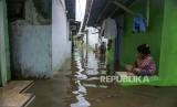 Warga duduk di depan rumahnya yang terendam banjir di Sampangan, Pekalongan, Jawa Tengah, Selasa (19/1/2021). Menurut pemerintah setempat, hujan deras yang terjadi sejak Senin (18/1) mengakibatkan banjir di beberapa kelurahan di Pekalongan, dengan ketinggian antara 30 centimeter-1,5 meter dan berdampak kepada 3.000 Kepala Keluarga (KK) dan 500 warga mengungsi di tempat pengungsian.  (FOTO : Harviyan Perdana Putra/ANTARA)
