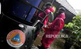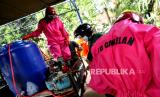 Pemuda Kampung Tanggap Bencana (KTB) Gamelan melakukan persiapan sebelum menyemprot rumah duka di Gamelan, Yogyakarta, Rabu (20/1). Setiap ada orang meninggal, KTB Gamelan akan menyemprot disinfektan rumah duka. Hal ini untuk memberikan kenyamanan penghuni rumah duka usai menjadi tempat berkumpul. Serta untuk mencegah penyebaran Covid-19. (FOTO : Wihdan Hidayat / Republika)