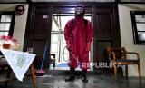 Pemuda Kampung Tanggap Bencana (KTB) Gamelan bersiap menyemprot rumah duka di Gamelan, Yogyakarta, Rabu (20/1). Setiap ada orang meninggal, KTB Gamelan akan menyemprot disinfektan rumah duka. Hal ini untuk memberikan kenyamanan penghuni rumah duka usai menjadi tempat berkumpul. Serta untuk mencegah penyebaran Covid-19. (FOTO : Wihdan Hidayat / Republika)