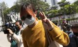 Aktivis pro-demokrasi Benja Apan memberikan hormat tiga jari sebagai simbol perlawanan, saat masuk ke kantor polisi Pathumwan di Bangkok, Thailand, Rabu (20/1). Enam aktivis pro-demokrasi, termasuk dua anak yang berusia dibawah 17 tahun, diperiksa polisi dengan tuduhan lese majeste yaitu tuduhan ujaran kebencian atau menghina anggota keluarga kerajaan Thailand. (FOTO : AP / Sakchai Lalit)