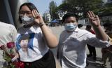 Aktivis pro-demokrasi Panusaya Sithijirawattanakul (kiri) dan Parit Chiwarak memberi hormat tiga jari tanda simbol perlawanan, berjalan ke kantor polisi Pathumwan di Bangkok, Thailand, Rabu (20/1). Enam aktivis pro-demokrasi, termasuk dua anak yang berusia dibawah 17 tahun, diperiksa polisi dengan tuduhan lese majeste yaitu tuduhan ujaran kebencian atau menghina anggota keluarga kerajaan Thailand. (FOTO : AP / Sakchai Lalit)