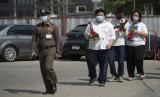 Aktivis prodemokrasi Parit Chiwarak (ketiga dari kanan) Panupong Jadnok dan Panusaya Sithijirawattanakul (kanan) berjalan menuju kantor polisi Pathumwan di Bangkok, Thailand, Rabu (20/1). Enam aktivis pro-demokrasi, termasuk dua anak yang berusia dibawah 17 tahun, diperiksa polisi dengan tuduhan lese majeste yaitu tuduhan ujaran kebencian atau menghina anggota keluarga kerajaan Thailand. (FOTO : AP / Sakchai Lalit)