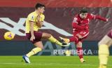 Pemain Liverpool Xherdan Shaqiri (kanan) melepas tendangan pada laga Liverpool melawan Burnley di Liverpool, Inggris, Jumat (22/1) dini hari WIB. (FOTO : AP / Jon Super, Pool)