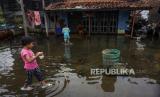 Anak-anak bermain di sekitar rumahnya yang tergenang banjir rob di Clumprit, Pekalongan, Jawa Tengah, Jumat (22/1). (FOTO : Harviyan Perdana Putra/ANTARA )