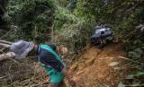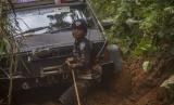 Relawan menggunakan mobil 4x4 mengantarkan logistik bantuan korban bencana tanah longsor menuju ke Desa Arangani di Kecamatan Hantakan, Kabupaten Hulu Sungai Tengah, Kalimantan Selatan, Jumat (22/1/2021). Sebanyak dua desa, enam dusun di Kecamatan Hantakan pedalaman meratus masih sulit untuk di akses akibat tanah longsor yang masih menutup jalan utama ke desa tersebut. (FOTO : ANTARA/Bayu Pratama S)