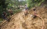 Sejumlah warga bergotong royong membuka akses jalan yang tertutup longsor akibat banjir bandang di Desa Arangani, Kabupaten Hulu Sungai Tengah, Kalimantan Selatan, Jumat (22/1).